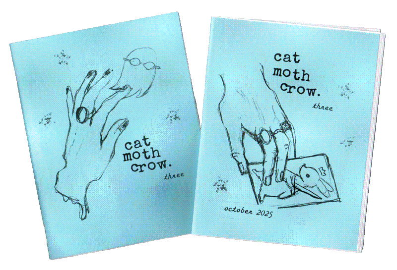 If you do end up writing a perzine using any of these prompts or ideas, let me know about it down in the comments; maybe we can make a trade! And if you’d like to check out catmothcrow three, copies of that zine are available in my shop.