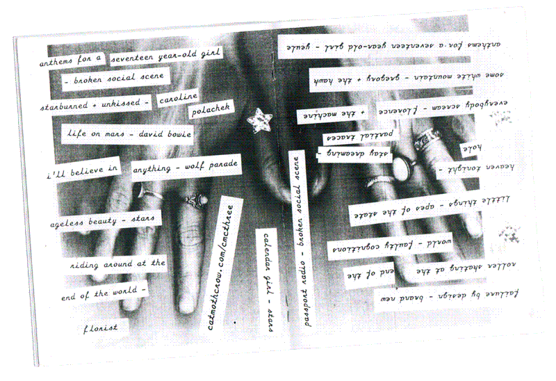 The centerfold of catmothcrow three is just that: a playlist that weaves itself through both sides of the zine, tying them together. Some of the songs are obvious picks (if you’ve seen I Saw the TV Glow, you know why “Anthems of a Seventeen Year Old Girl” is on there twice), while others felt referential in a way that only makes sense to me, but I hope that you catch still the vibe all the same.