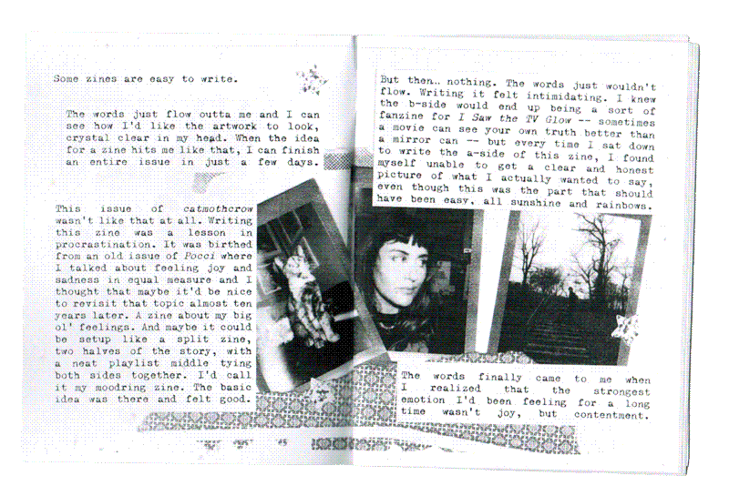 catmothcrow three got its start as an issue of Pocci, my perzine series from the ’10s. That issue begins: “I am curious about joy… what defines joy and how is it any different than happiness, or comfort?” In the zine, I talked about the trouble with finding pride in being a “sad girl” when you’re feeling pretty happy, and the ways that joy feels like firecrackers and starlight, all fleeting and radiant. I re-read the zine last year, and was struck by how much it still resonated with me; often times, old perzines can feel like they were written by someone else entirely, someone less assured in themselves, less confident. But not only did so much of the writing in that particular issue resonate, but it made me eager to explore my relationship to those feelings now, in my thirties.