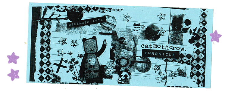 All SMS members get a monthly print newsletter — the catmothcrow chronicle. Over the past seven months, newsletter topics have included: musings on snail energy, a jogging playlist, the history of getting “gold stars” for achievements, my thoughts on Pride celebrations, a Summer bingo card to fight off summertime SADness, musings about the state of the world and holding space for both chaos and calm, a vacation diary about a trip to Boston, musings about busy-ness and projects (a perpetual topic for me, it seems!), dispatches from KC Zine Con #10, spooky season plans, a cookie recipe, my favorite media from 2025, and an ode to the Kill Bill films. In addition to the newsletter, higher tiers also get perks like a monthly playlist, behind-the-scenes blogs, and an exclusive monthly mini (which, this year, will be dedicated to a film review project! Snails, I’ll tell y’all more about this when I post January’s chronicle preview on the 15th.) This year, I’m also going to be scanning and uploading some of my older, out-of-print zines as a perk for the Star tier.